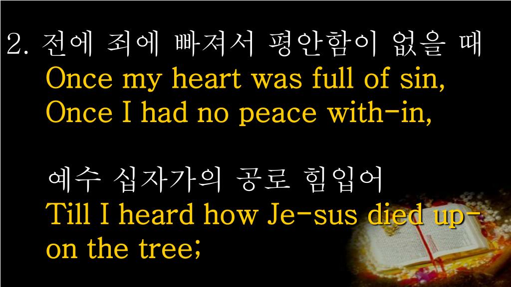 2. 전에 죄에 빠져서 평안함이 없을 때Once my heart was full of sin,Once I had no peace with-in,예수 십자가의 공로 힘입어Till I heard how Je-sus died up-on the tree;