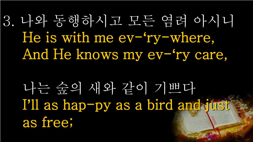 3. 나와 동행하시고 모든 염려 아시니 He is with me ev-‘ry-where,And He knows my ev-‘ry care,나는 숲의 새와 같이 기쁘다I’ll as hap-py as a bird and just as free;