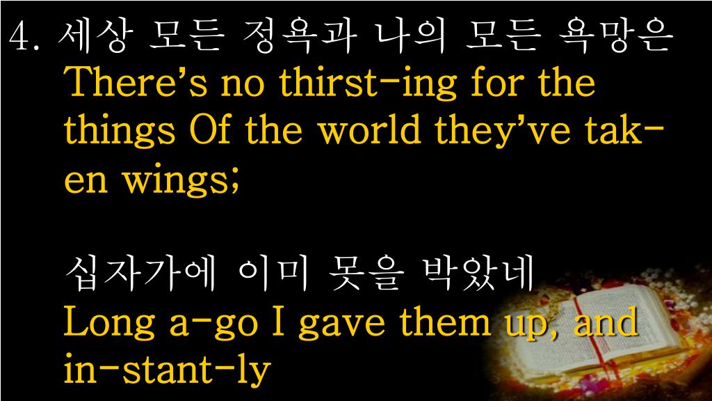 4. 세상 모든 정욕과 나의 모든 욕망은There’s no thirst-ing for the things Of the world they’ve tak-en wings;십자가에 이미 못을 박았네Long a-go I gave them up, and in-stant-ly