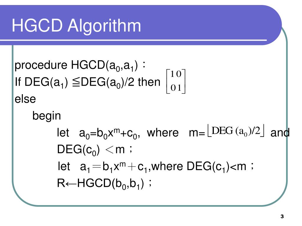 HGCD Algorithm procedure HGCD(a0,a1): If DEG(a1) ≦DEG(a0)/2 then else begin let a0=b0xm+c0, where m= and DEG(c0) <m; let a1=b1xm+c1,where DEG(c1)<m; R←HGCD(b0,b1);