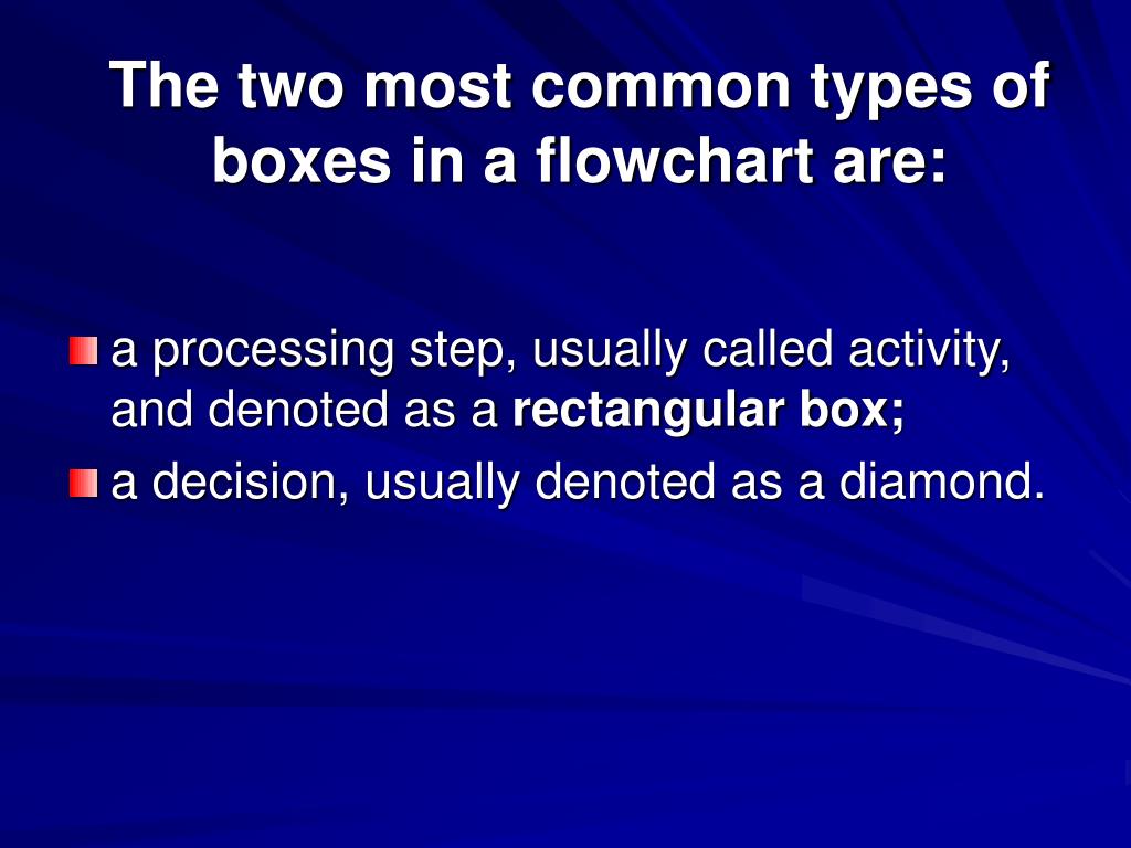The two most common types of boxes in a flowchart are: • a processing step, usually called activity, and denoted as a rectangular box; • a decision, usually denoted as a diamond.