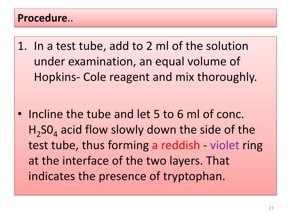 Procedure.. • In a test tube, add to 2 ml of the solution under examination, an equal volume of Hopkins- Cole reagent and mix thoroughly. • Incline the tube and let 5 to 6 ml of conc. H2S04 acid flow slowly down the side of the test tube, thus forming a reddish - violet ring at the interface of the two layers. That indicates the presence of tryptophan.