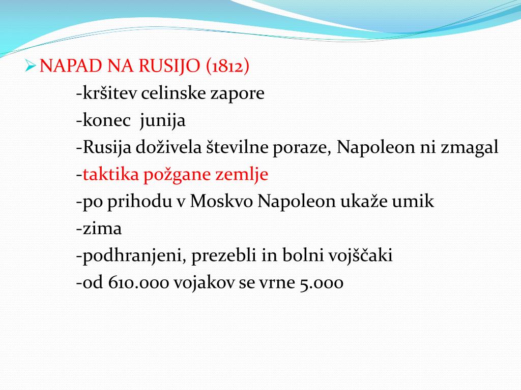 NAPAD NA RUSIJO (1812) -kršitev celinske zapore -konec junija -Rusija doživela številne poraze, Napoleon ni zmagal -taktika požgane zemlje -po prihodu v Moskvo Napoleon ukaže umik -zima -podhranjeni, prezebli in bolni vojščaki -od 610.000 vojakov se vrne 5.000