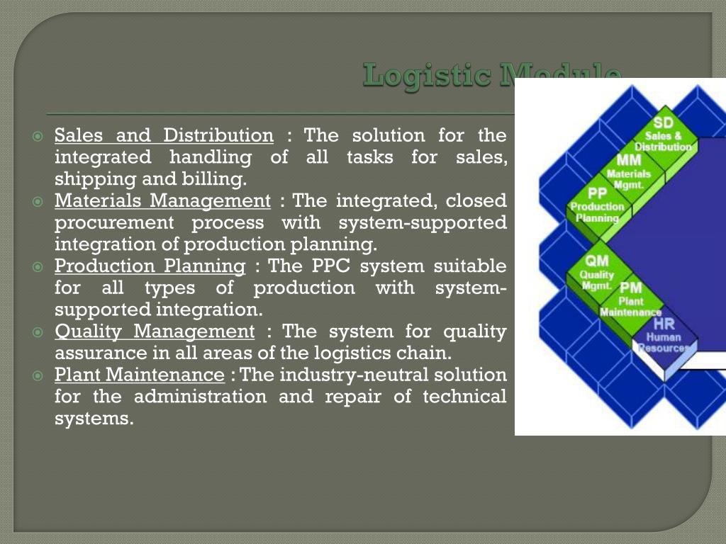 Logistic Module Sales and Distribution : The solution for the integrated handling of all tasks for sales, shipping and billing. Materials Management : The integrated, closed procurement process with system-supported integration of production planning. Production Planning : The PPC system suitable for all types of production with system-supported integration. Quality Management : The system for quality assurance in all areas of the logistics chain. Plant Maintenance : The industry-neutral solution for the administration and repair of technical systems.