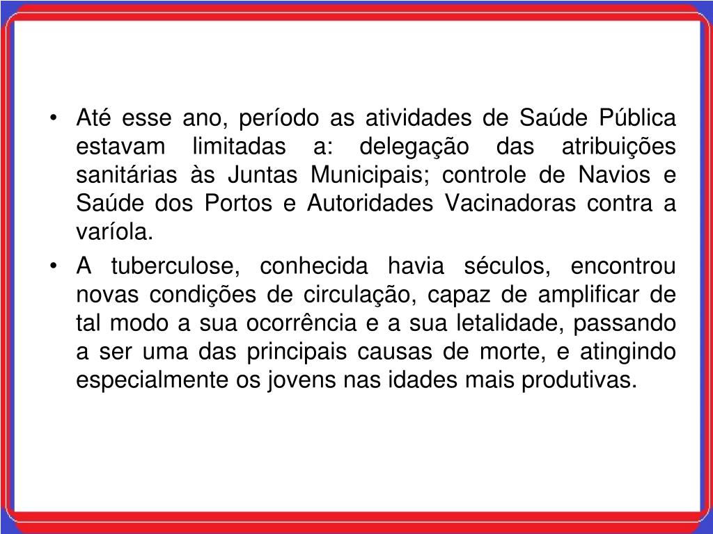 Até esse ano, período as atividades de Saúde Pública estavam limitadas a: delegação das atribuições sanitárias às Juntas Municipais; controle de Navios e Saúde dos Portos e Autoridades Vacinadoras contra a varíola. • A tuberculose, conhecida havia séculos, encontrou novas condições de circulação, capaz de amplificar de tal modo a sua ocorrência e a sua letalidade, passando a ser uma das principais causas de morte, e atingindo especialmente os jovens nas idades mais produtivas.
