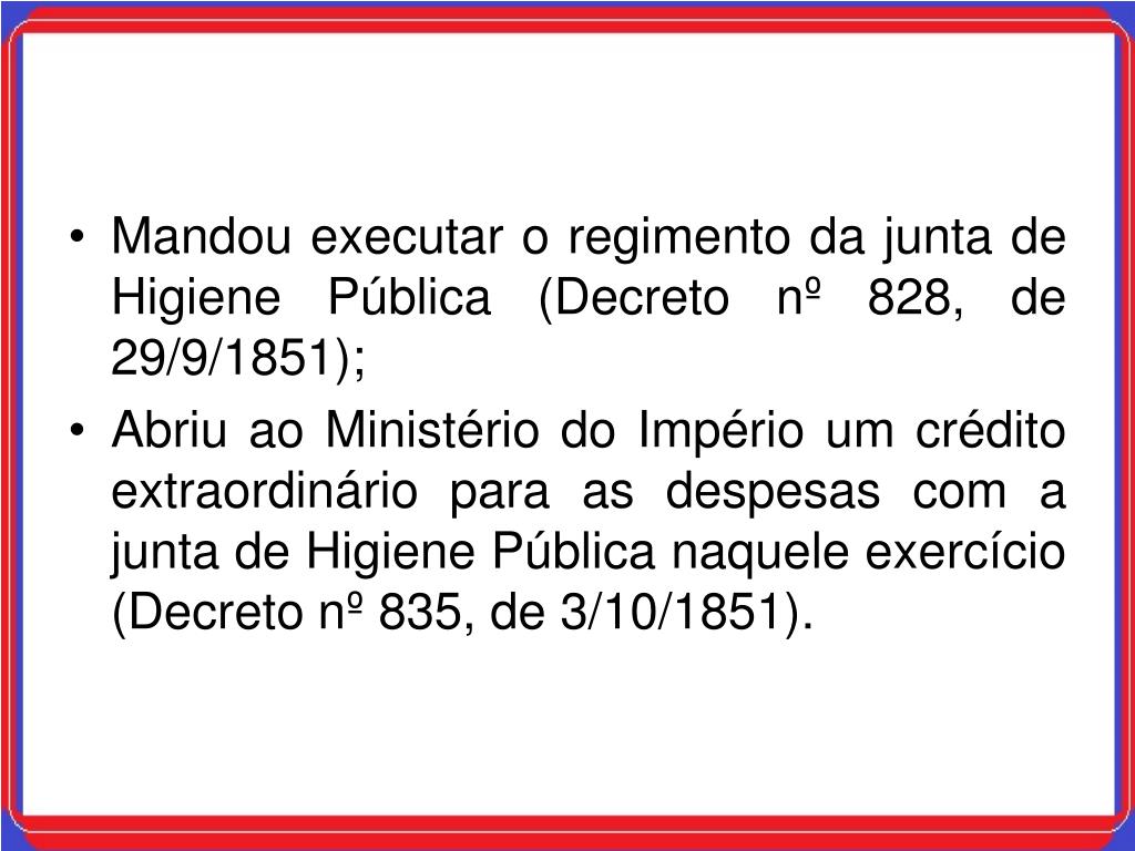 1851 Regulamentação da lei que criou a Junta Central de Higiene Pública, subordinada ao Ministro do Império. Abriu ao Ministério do Império um crédito extraordinário para despesas com providências sanitárias tendentes a atalhar o progresso da febre amarela a prevenir o seu reaparecimento e a socorrer os enfermos necessitados (Decreto nº 752, de 8/1/1851). Mandou executar o regulamento do registro dos nascimentos e óbitos (Decreto nº 798, de 18/6/1851). Abriu ao Ministério do Império um crédito extraordinário para as despesas com a epidemia de bexigas, na província do Pará e em outras (Decreto nº 826, de 26/9/1851).