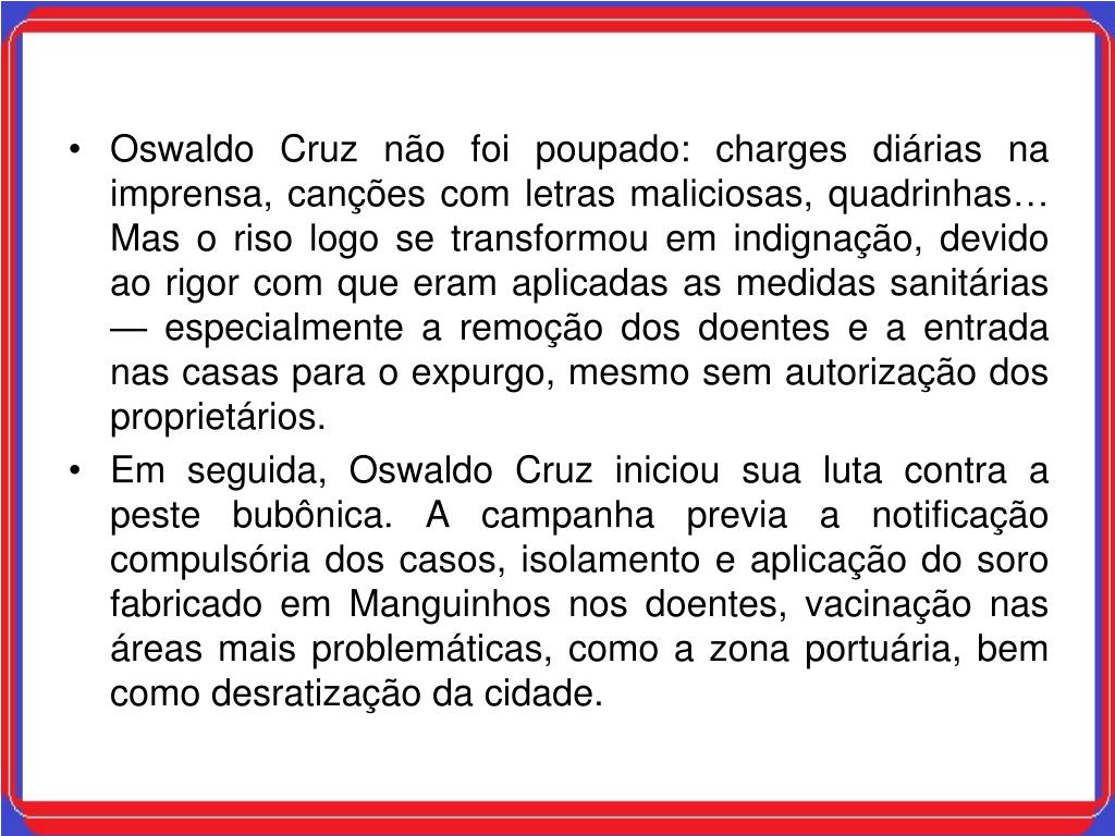 Oswaldo Cruz não foi poupado: charges diárias na imprensa, canções com letras maliciosas, quadrinhas… Mas o riso logo se transformou em indignação, devido ao rigor com que eram aplicadas as medidas sanitárias — especialmente a remoção dos doentes e a entrada nas casas para o expurgo, mesmo sem autorização dos proprietários. Em seguida, Oswaldo Cruz iniciou sua luta contra a peste bubônica. A campanha previa a notificação compulsória dos casos, isolamento e aplicação do soro fabricado em Manguinhos nos doentes, vacinação nas áreas mais problemáticas, como a zona portuária, bem como desratização da cidade.