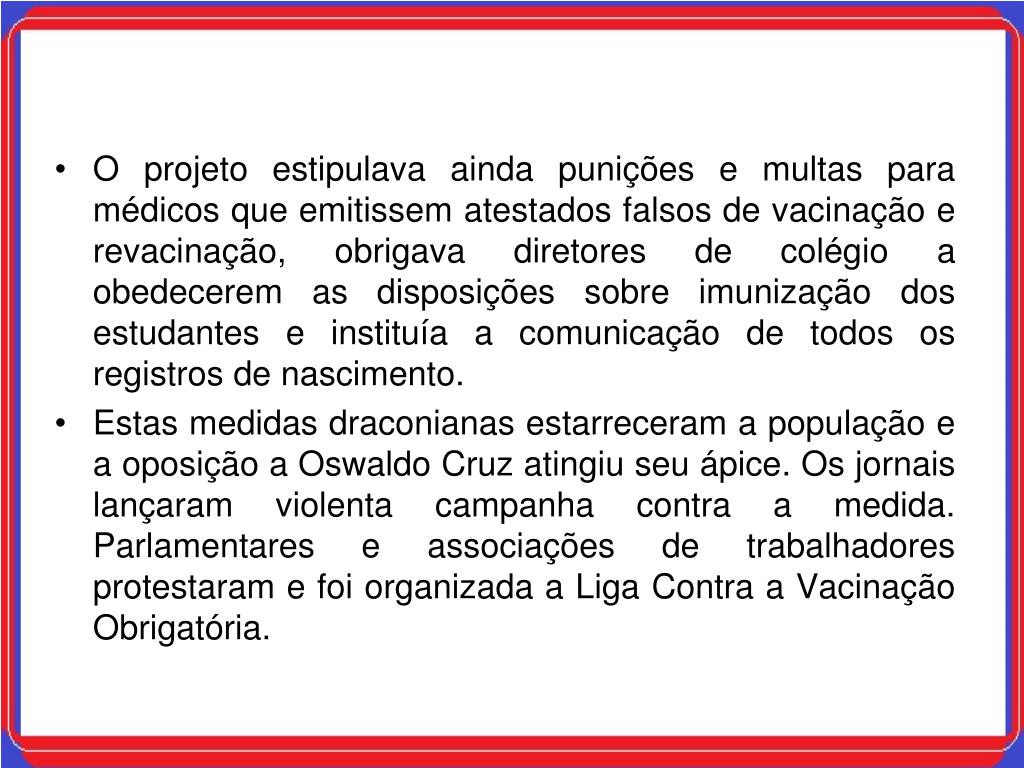 O projeto estipulava ainda punições e multas para médicos que emitissem atestados falsos de vacinação e revacinação, obrigava diretores de colégio a obedecerem as disposições sobre imunização dos estudantes e instituía a comunicação de todos os registros de nascimento. Estas medidas draconianas estarreceram a população e a oposição a Oswaldo Cruz atingiu seu ápice. Os jornais lançaram violenta campanha contra a medida. Parlamentares e associações de trabalhadores protestaram e foi organizada a Liga Contra a Vacinação Obrigatória.