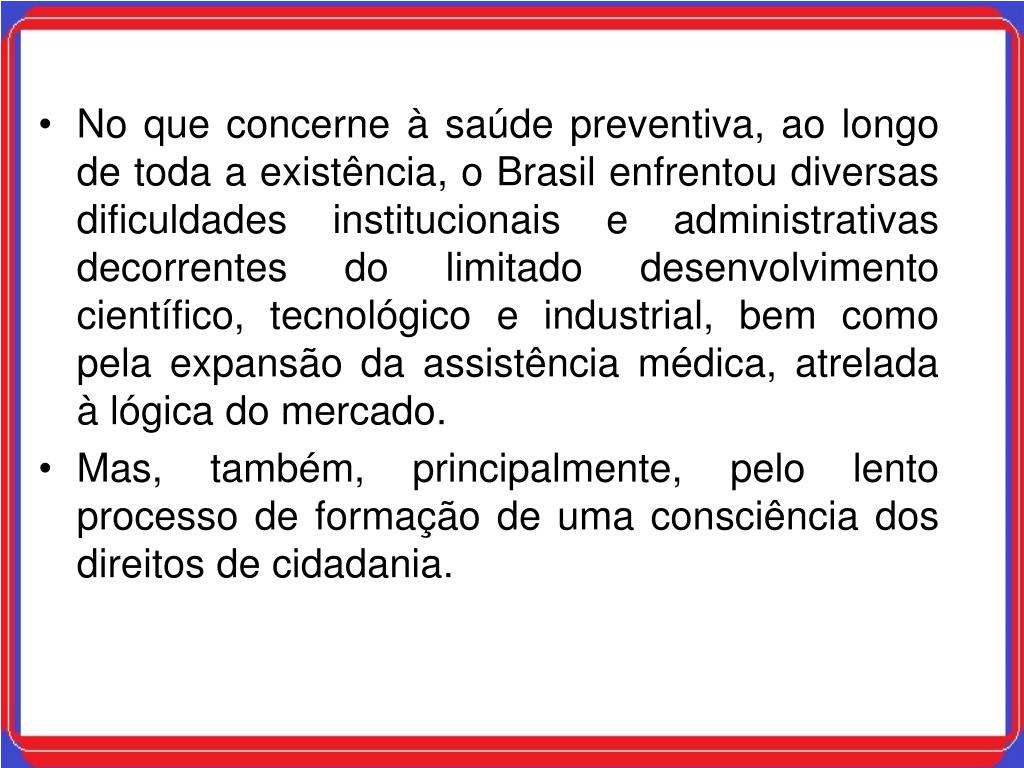 No que concerne à saúde preventiva, ao longo de toda a existência, o Brasil enfrentou diversas dificuldades institucionais e administrativas decorrentes do limitado desenvolvimento científico, tecnológico e industrial, bem como pela expansão da assistência médica, atrelada à lógica do mercado. • Mas, também, principalmente, pelo lento processo de formação de uma consciência dos direitos de cidadania.