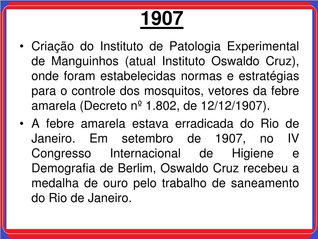 1907 Criação do Instituto de Patologia Experimental de Manguinhos (atual Instituto Oswaldo Cruz), onde foram estabelecidas normas e estratégias para o controle dos mosquitos, vetores da febre amarela (Decreto nº 1.802, de 12/12/1907). A febre amarela estava erradicada do Rio de Janeiro. Em setembro de 1907, no IV Congresso Internacional de Higiene e Demografia de Berlim, Oswaldo Cruz recebeu a medalha de ouro pelo trabalho de saneamento do Rio de Janeiro.