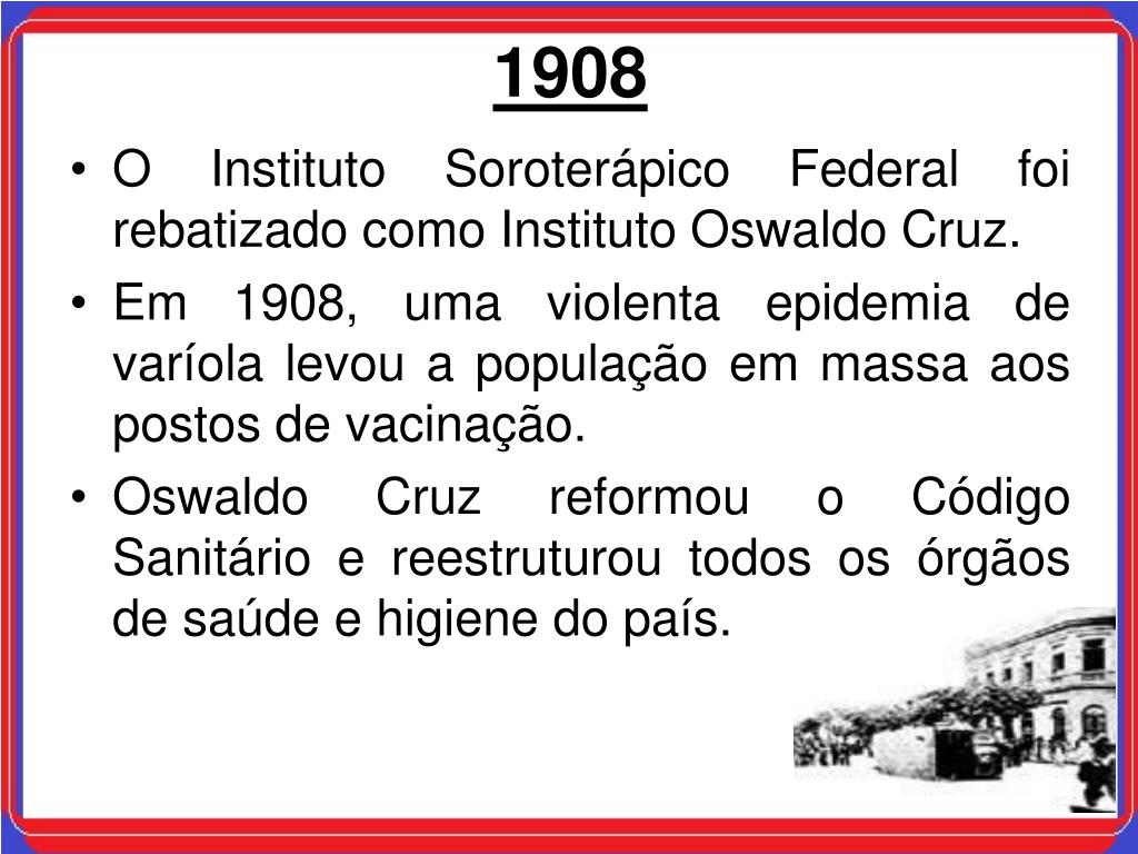 1908 O Instituto Soroterápico Federal foi rebatizado como Instituto Oswaldo Cruz. Em 1908, uma violenta epidemia de varíola levou a população em massa aos postos de vacinação. Oswaldo Cruz reformou o Código Sanitário e reestruturou todos os órgãos de saúde e higiene do país.