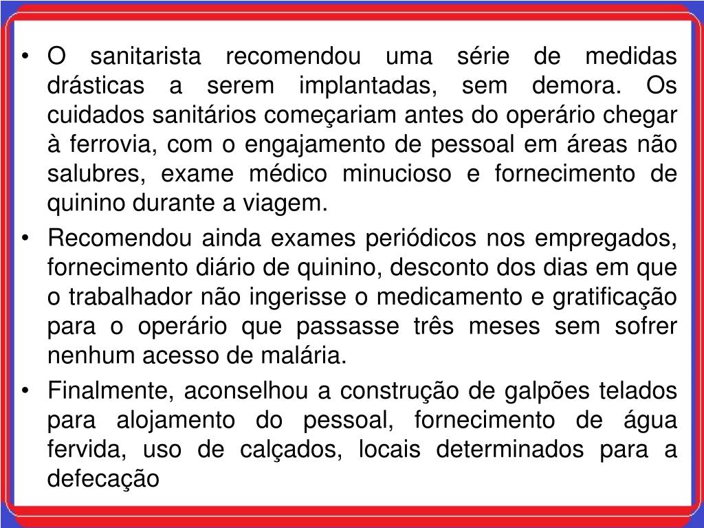 O sanitarista recomendou uma série de medidas drásticas a serem implantadas, sem demora. Os cuidados sanitários começariam antes do operário chegar à ferrovia, com o engajamento de pessoal em áreas não salubres, exame médico minucioso e fornecimento de quinino durante a viagem. Recomendou ainda exames periódicos nos empregados, fornecimento diário de quinino, desconto dos dias em que o trabalhador não ingerisse o medicamento e gratificação para o operário que passasse três meses sem sofrer nenhum acesso de malária. Finalmente, aconselhou a construção de galpões telados para alojamento do pessoal, fornecimento de água fervida, uso de calçados, locais determinados para a defecação