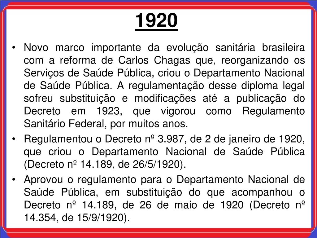 1920 Novo marco importante da evolução sanitária brasileira com a reforma de Carlos Chagas que, reorganizando os Serviços de Saúde Pública, criou o Departamento Nacional de Saúde Pública. A regulamentação desse diploma legal sofreu substituição e modificações até a publicação do Decreto em 1923, que vigorou como Regulamento Sanitário Federal, por muitos anos. Regulamentou o Decreto nº 3.987, de 2 de janeiro de 1920, que criou o Departamento Nacional de Saúde Pública (Decreto nº 14.189, de 26/5/1920). Aprovou o regulamento para o Departamento Nacional de Saúde Pública, em substituição do que acompanhou o Decreto nº 14.189, de 26 de maio de 1920 (Decreto nº 14.354, de 15/9/1920).