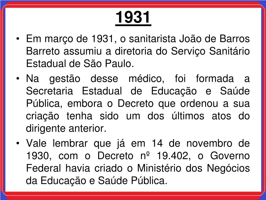 1931 Em março de 1931, o sanitarista João de Barros Barreto assumiu a diretoria do Serviço Sanitário Estadual de São Paulo. Na gestão desse médico, foi formada a Secretaria Estadual de Educação e Saúde Pública, embora o Decreto que ordenou a sua criação tenha sido um dos últimos atos do dirigente anterior. Vale lembrar que já em 14 de novembro de 1930, com o Decreto nº 19.402, o Governo Federal havia criado o Ministério dos Negócios da Educação e Saúde Pública.