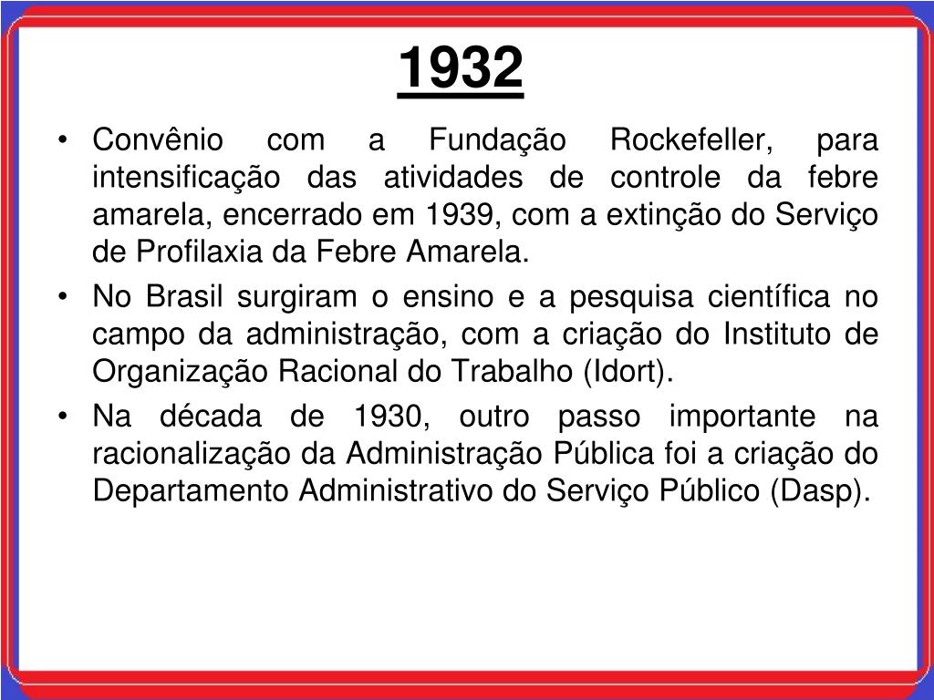1932 Convênio com a Fundação Rockefeller, para intensificação das atividades de controle da febre amarela, encerrado em 1939, com a extinção do Serviço de Profilaxia da Febre Amarela. No Brasil surgiram o ensino e a pesquisa científica no campo da administração, com a criação do Instituto de Organização Racional do Trabalho (Idort). Na década de 1930, outro passo importante na racionalização da Administração Pública foi a criação do Departamento Administrativo do Serviço Público (Dasp).