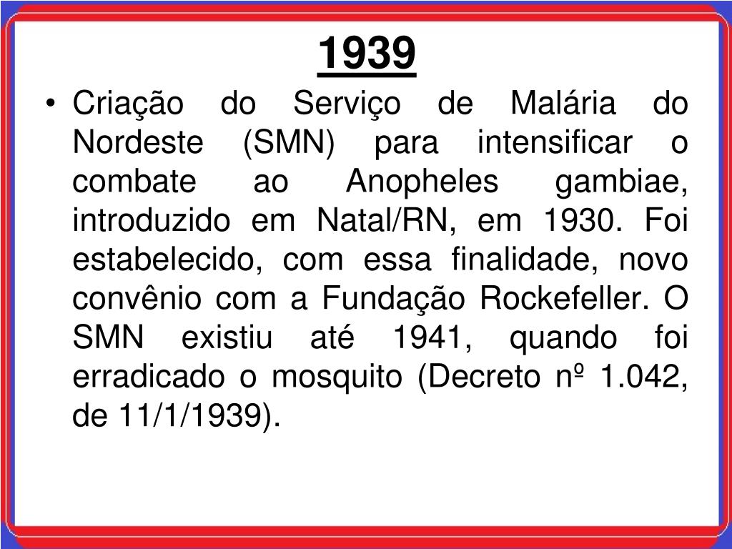 1939 Criação do Serviço de Malária do Nordeste (SMN) para intensificar o combate ao Anopheles gambiae, introduzido em Natal/RN, em 1930. Foi estabelecido, com essa finalidade, novo convênio com a Fundação Rockefeller. O SMN existiu até 1941, quando foi erradicado o mosquito (Decreto nº 1.042, de 11/1/1939).