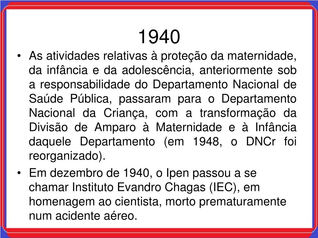 1940 As atividades relativas à proteção da maternidade, da infância e da adolescência, anteriormente sob a responsabilidade do Departamento Nacional de Saúde Pública, passaram para o Departamento Nacional da Criança, com a transformação da Divisão de Amparo à Maternidade e à Infância daquele Departamento (em 1948, o DNCr foi reorganizado). Em dezembro de 1940, o Ipen passou a se chamar Instituto Evandro Chagas (IEC), em homenagem ao cientista, morto prematuramente num acidente aéreo.