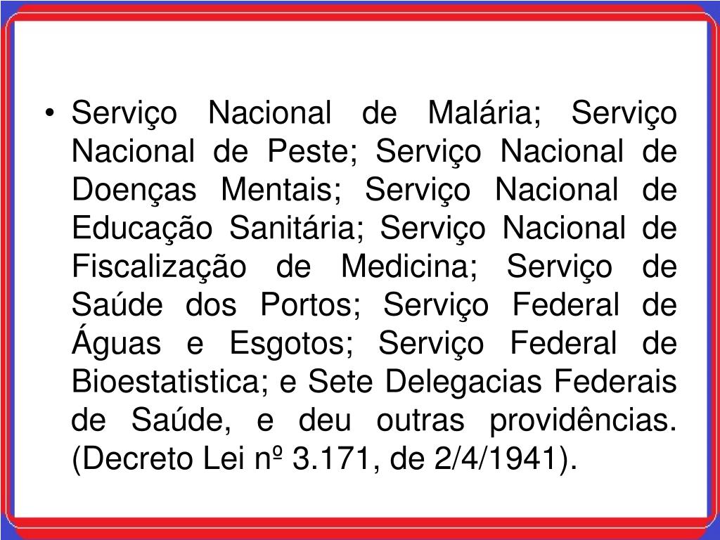 Serviço Nacional de Malária; Serviço Nacional de Peste; Serviço Nacional de Doenças Mentais; Serviço Nacional de Educação Sanitária; Serviço Nacional de Fiscalização de Medicina; Serviço de Saúde dos Portos; Serviço Federal de Águas e Esgotos; Serviço Federal de Bioestatistica; e Sete Delegacias Federais de Saúde, e deu outras providências. (Decreto Lei nº 3.171, de 2/4/1941).