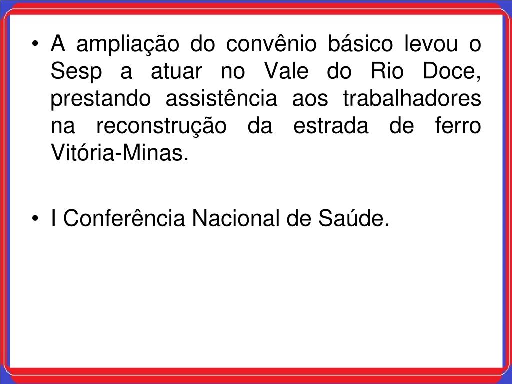 A ampliação do convênio básico levou o Sesp a atuar no Vale do Rio Doce, prestando assistência aos trabalhadores na reconstrução da estrada de ferro Vitória-Minas. I Conferência Nacional de Saúde.