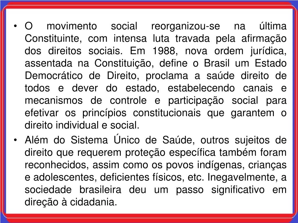 O movimento social reorganizou-se na última Constituinte, com intensa luta travada pela afirmação dos direitos sociais. Em 1988, nova ordem jurídica, assentada na Constituição, define o Brasil um Estado Democrático de Direito, proclama a saúde direito de todos e dever do estado, estabelecendo canais e mecanismos de controle e participação social para efetivar os princípios constitucionais que garantem o direito individual e social. Além do Sistema Único de Saúde, outros sujeitos de direito que requerem proteção específica também foram reconhecidos, assim como os povos indígenas, crianças e adolescentes, deficientes físicos, etc. Inegavelmente, a sociedade brasileira deu um passo significativo em direção à cidadania.