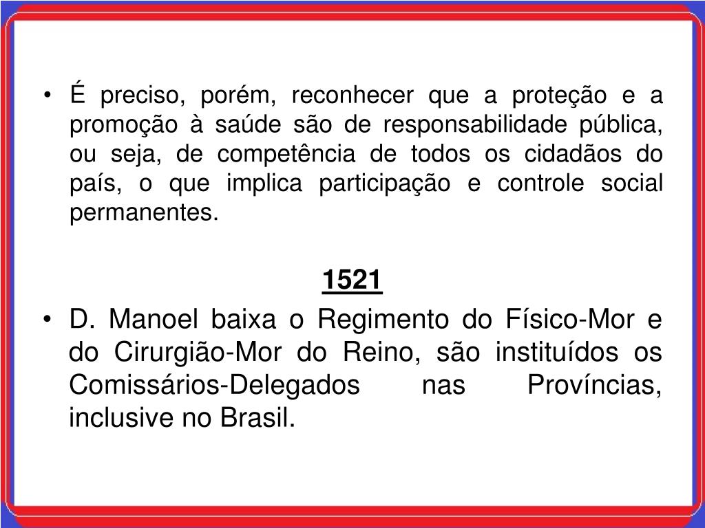 1521 D. Manoel baixa o Regimento do Físico-Mor e do Cirurgião-Mor do Reino, são instituídos os Comissários-Delegados nas Províncias, inclusive no Brasil. • É preciso, porém, reconhecer que a proteção e a promoção à saúde são de responsabilidade pública, ou seja, de competência de todos os cidadãos do país, o que implica participação e controle social permanentes.