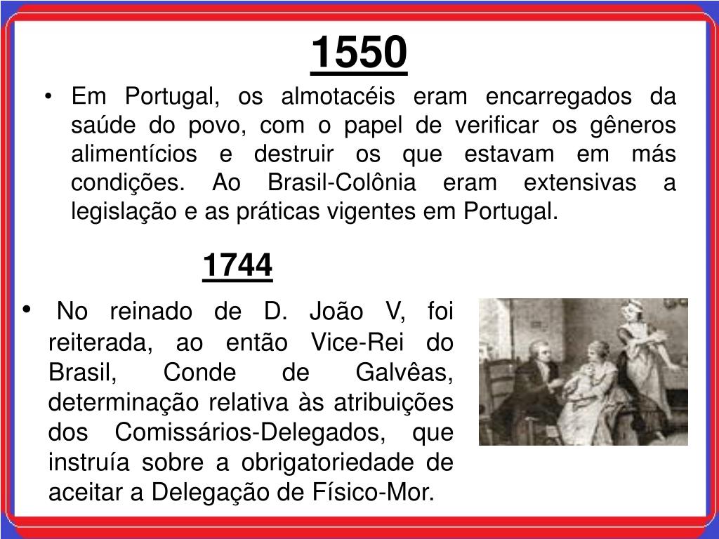 Em Portugal, os almotacéis eram encarregados da saúde do povo, com o papel de verificar os gêneros alimentícios e destruir os que estavam em más condições. Ao Brasil-Colônia eram extensivas a legislação e as práticas vigentes em Portugal. 1550 • 1744 • No reinado de D. João V, foi reiterada, ao então Vice-Rei do Brasil, Conde de Galvêas, determinação relativa às atribuições dos Comissários-Delegados, que instruía sobre a obrigatoriedade de aceitar a Delegação de Físico-Mor.
