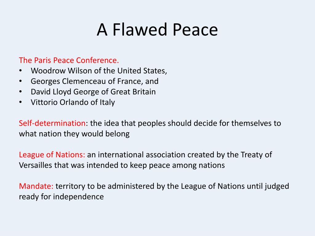 A Flawed Peace The Paris Peace Conference. • Woodrow Wilson of the United States, • Georges Clemenceau of France, and • David Lloyd George of Great Britain • Vittorio Orlando of Italy Self-determination: the idea that peoples should decide for themselves to what nation they would belong League of Nations: an international association created by the Treaty of Versailles that was intended to keep peace among nations Mandate: territory to be administered by the League of Nations until judged ready for independence
