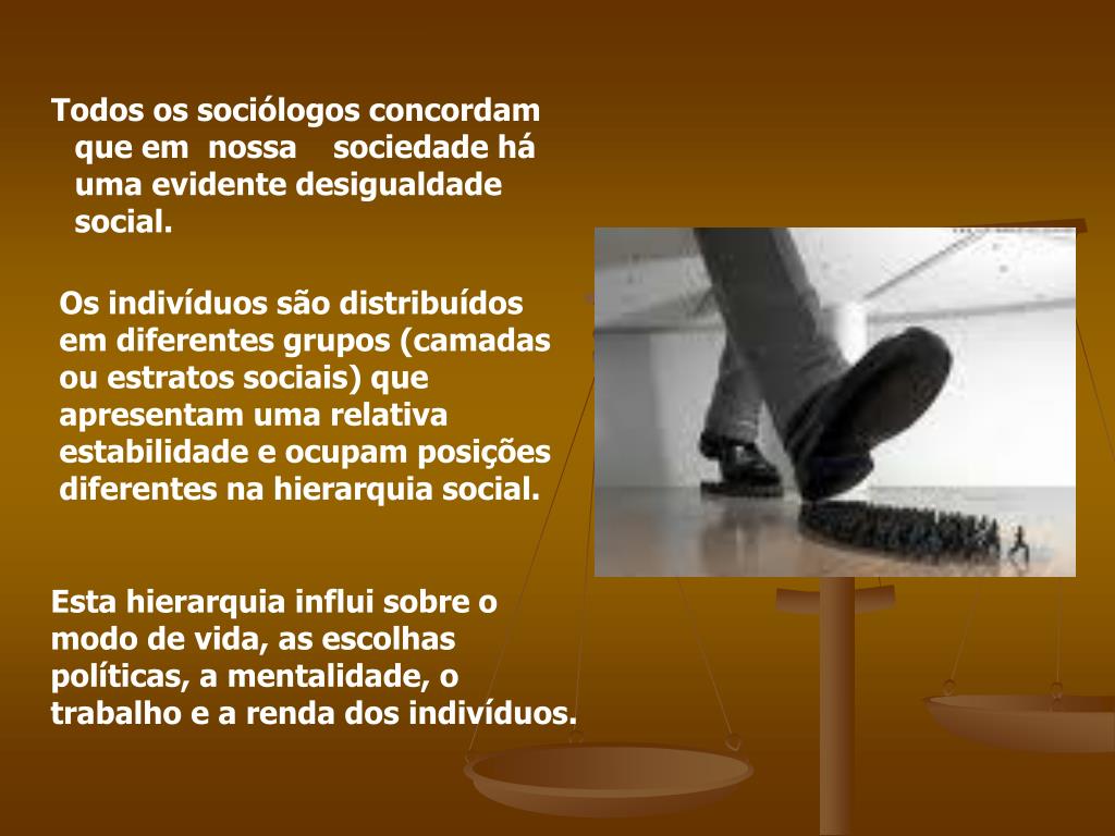 Todos os sociólogos concordam que em nossa sociedade há uma evidente desigualdade social. Os indivíduos são distribuídos em diferentes grupos (camadas ou estratos sociais) que apresentam uma relativa estabilidade e ocupam posições diferentes na hierarquia social. Esta hierarquia influi sobre o modo de vida, as escolhas políticas, a mentalidade, o trabalho e a renda dos indivíduos.