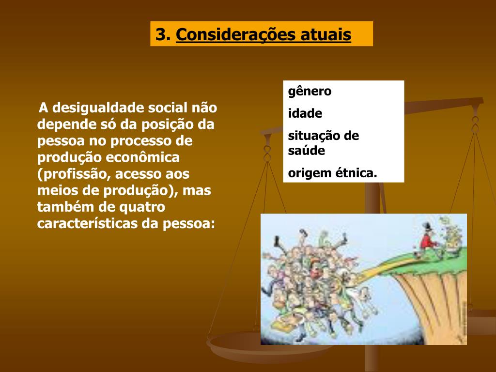 3. Considerações atuais gênero idade situação de saúde origem étnica. A desigualdade social não depende só da posição da pessoa no processo de produção econômica (profissão, acesso aos meios de produção), mas também de quatro características da pessoa: