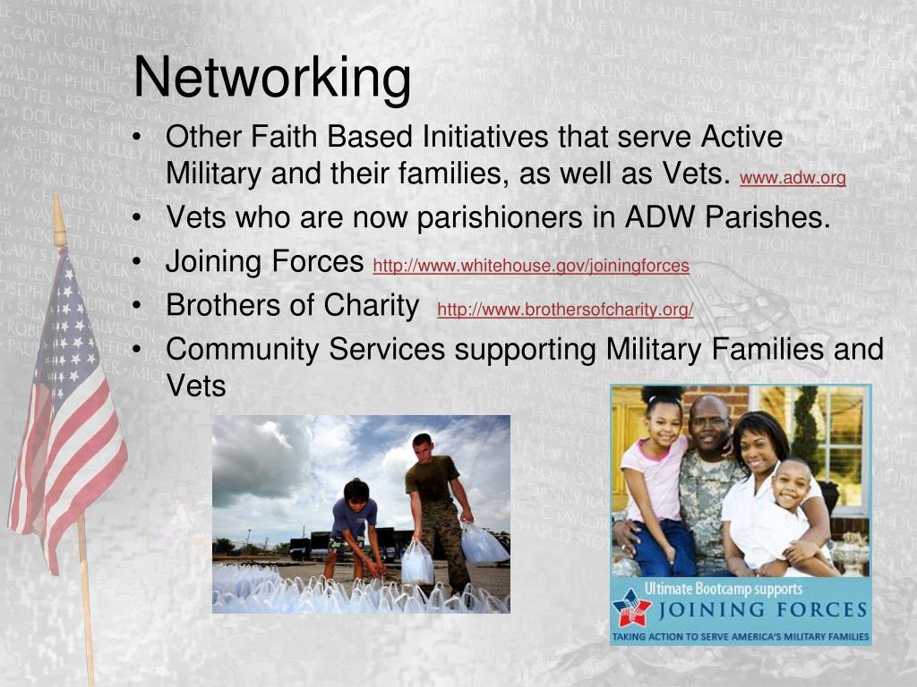 Networking • Other Faith Based Initiatives that serve Active Military and their families, as well as Vets. www.adw.org • Vets who are now parishioners in ADW Parishes. • Joining Forces http://www.whitehouse.gov/joiningforces • Brothers of Charity http://www.brothersofcharity.org/ • Community Services supporting Military Families and Vets