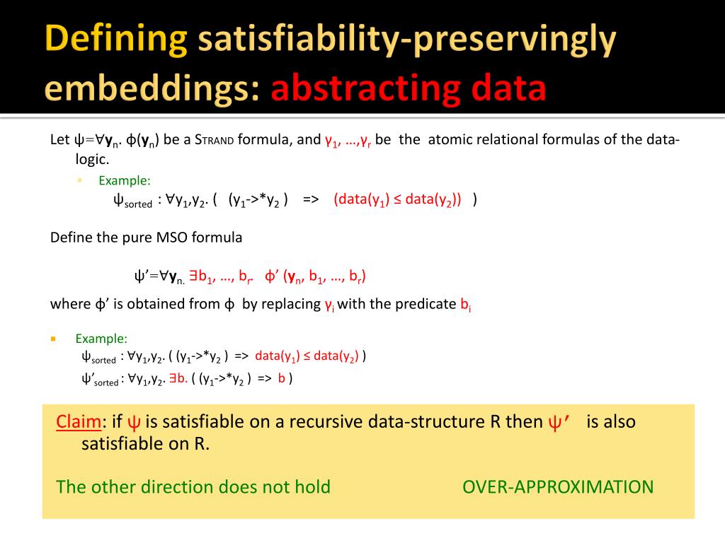 Definingsatisfiability-preservinglyembeddings: abstractingdata Let ψ=∀yn. φ(yn) be a STRAND formula, and γ1, …,γrbe the atomic relational formulas of the data-logic. • Example: ψsorted : ∀y1,y2. ( (y1->*y2 ) => (data(y1) ≤ data(y2)) ) Define the pure MSO formula ψ’=∀yn. ∃b1, …, br.φ’ (yn,b1, …, br) where φ’ is obtainedfromφ by replacingγiwith the predicate bi • Example: ψsorted : ∀y1,y2. ( (y1->*y2 ) => data(y1) ≤ data(y2) ) ψ’sorted : ∀y1,y2.∃b. ( (y1->*y2 ) => b) • Claim: ifψ is satisfiable on a recursive data-structure R thenψ’ is also satisfiable on R. • The other direction doesnothold OVER-APPROXIMATION