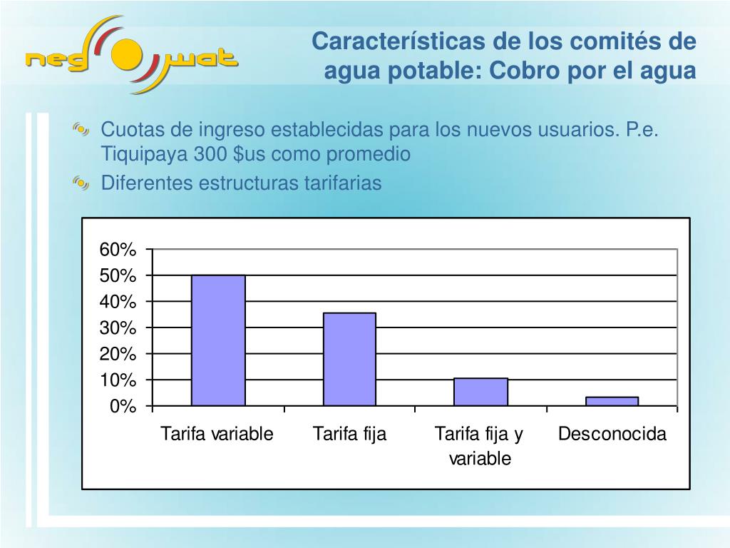 Características de los comités de agua potable: Cobro por el agua • Cuotas de ingreso establecidas para los nuevos usuarios. P.e. Tiquipaya 300 $us como promedio • Diferentes estructuras tarifarias