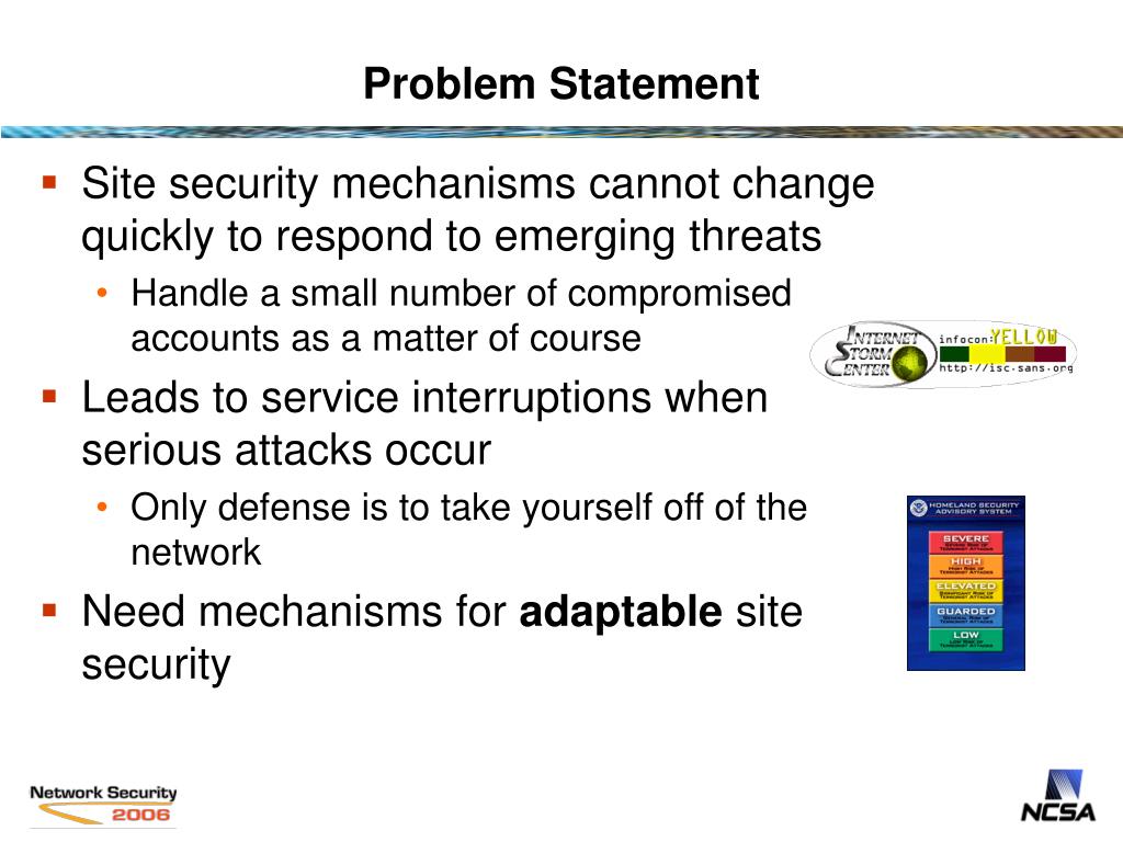 Problem Statement • Site security mechanisms cannot change quickly to respond to emerging threats • Handle a small number of compromised accounts as a matter of course • Leads to service interruptions when serious attacks occur • Only defense is to take yourself off of the network • Need mechanisms for adaptable site security