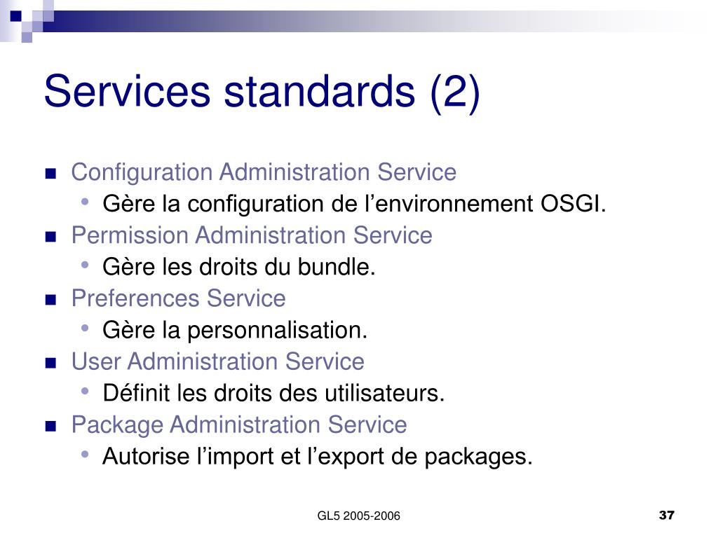 Services standards (2) • Configuration Administration Service • Gère la configuration de l’environnement OSGI. • Permission Administration Service • Gère les droits du bundle. • Preferences Service • Gère la personnalisation. • User Administration Service • Définit les droits des utilisateurs. • Package Administration Service • Autorise l’import et l’export de packages. GL5 2005-2006