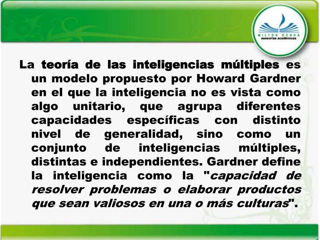 La teoría de las inteligencias múltiples es un modelo propuesto por Howard Gardner en el que la inteligencia no es vista como algo unitario, que agrupa diferentes capacidades específicas con distinto nivel de generalidad, sino como un conjunto de inteligencias múltiples, distintas e independientes. Gardner define la inteligencia como la "capacidad de resolver problemas o elaborar productos que sean valiosos en una o más culturas".