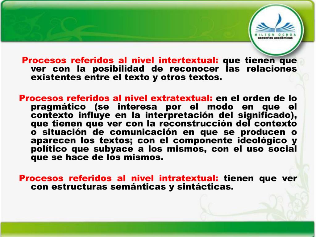 Procesos referidos al nivel intertextual: que tienen que ver con la posibilidad de reconocer las relaciones existentes entre el texto y otros textos. Procesos referidos al nivel extratextual: en el orden de lo pragmático (se interesa por el modo en que el contexto influye en la interpretación del significado), que tienen que ver con la reconstrucción del contexto o situación de comunicación en que se producen o aparecen los textos; con el componente ideológico y político que subyace a los mismos, con el uso social que se hace de los mismos. Procesos referidos al nivel intratextual: tienen que ver con estructuras semánticas y sintácticas.