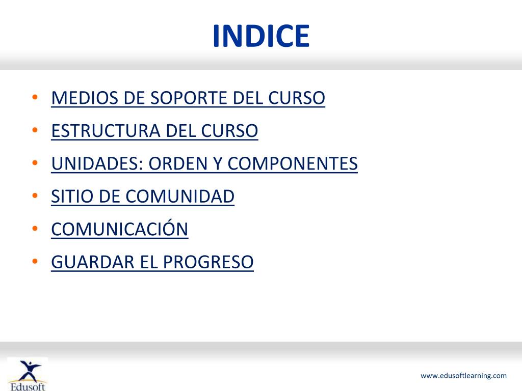 INDICE • MEDIOS DE SOPORTE DEL CURSO • ESTRUCTURA DEL CURSO • UNIDADES: ORDEN Y COMPONENTES • SITIO DE COMUNIDAD • COMUNICACIÓN • GUARDAR EL PROGRESO
