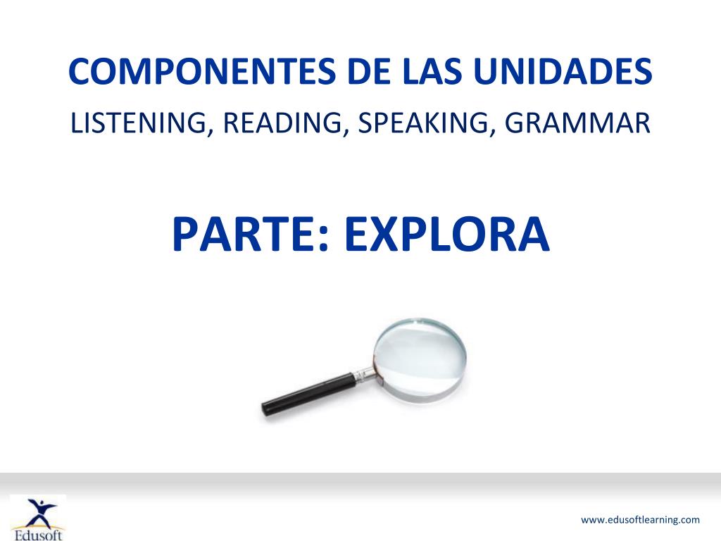 COMPONENTES DE LAS UNIDADES LISTENING, READING, SPEAKING, GRAMMAR PARTE: EXPLORA