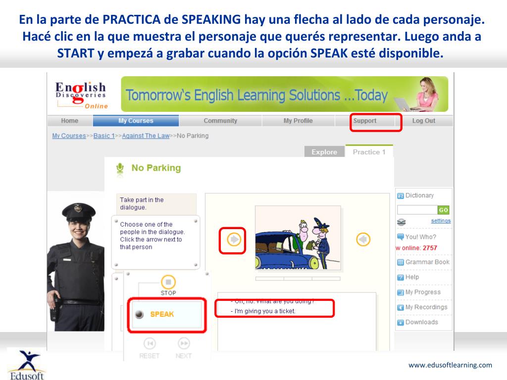 En la parte de PRACTICA de SPEAKING hay una flecha al lado de cada personaje. Hacé clic en la que muestra el personaje que querés representar. Luego anda a START y empezá a grabar cuando la opción SPEAK esté disponible.
