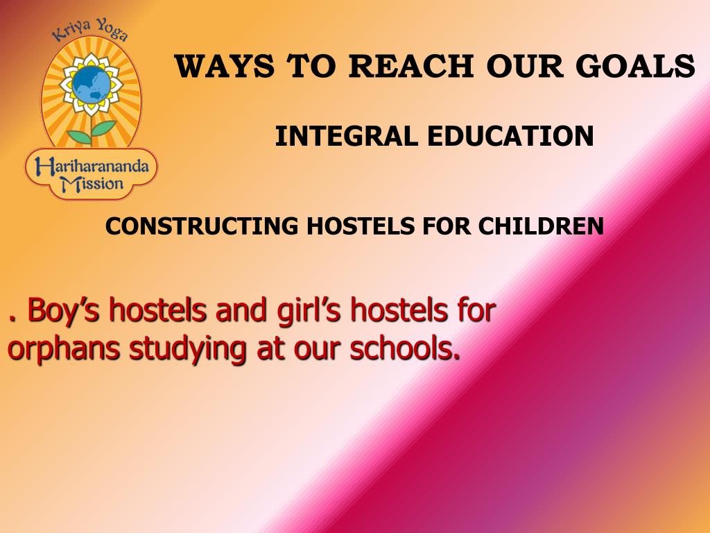 WAYS TO REACH OUR GOALS INTEGRAL EDUCATION CONSTRUCTING HOSTELS FOR CHILDREN . Boy’shostels and girl’shostelsfororphansstudying at ourschools.