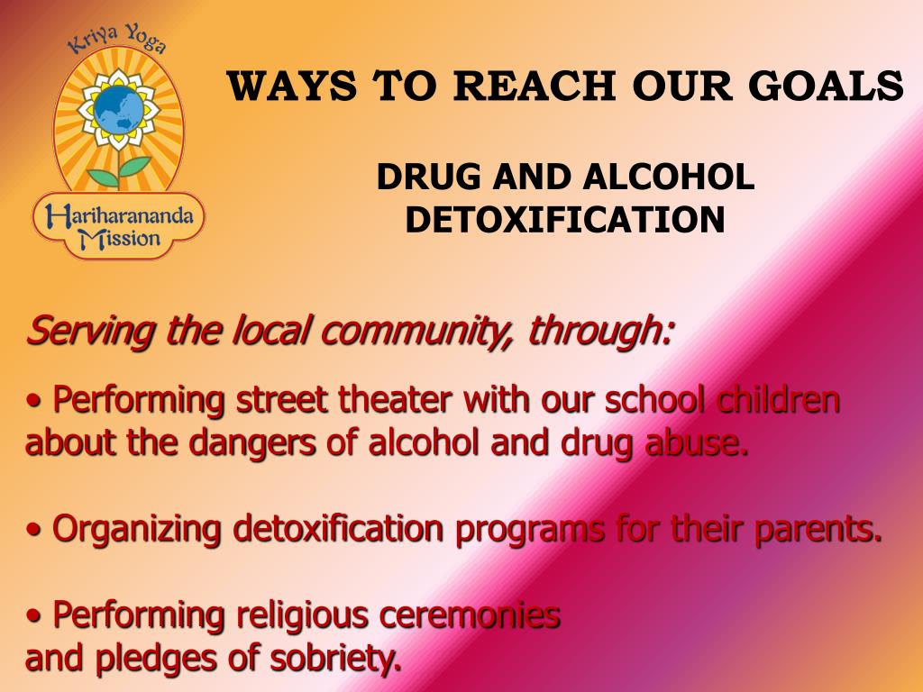 WAYS TO REACH OUR GOALS DRUG AND ALCOHOL DETOXIFICATION • Servingthe local community, through: • Performingstreettheaterwithourschoolchildrenaboutthedangers of alcohol and drug abuse. • Organizingdetoxificationprogramsfortheirparents. • Performingreligiousceremoniesand pledges of sobriety.