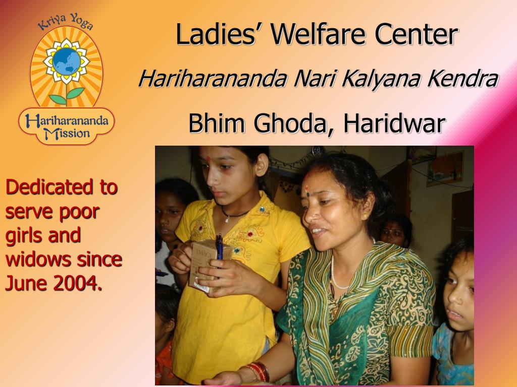 Ladies’ Welfare Center Hariharananda NariKalyana Kendra BhimGhoda, Haridwar Dedicated to serve poor girls and widows since June 2004.