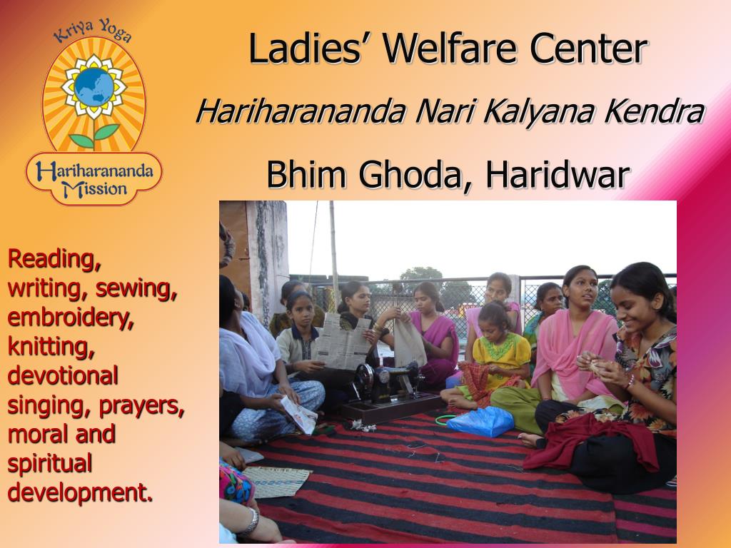 Ladies’ Welfare Center Hariharananda NariKalyana Kendra BhimGhoda, Haridwar Reading, writing, sewing, embroidery, knitting, devotional singing, prayers, moral and spiritual development.