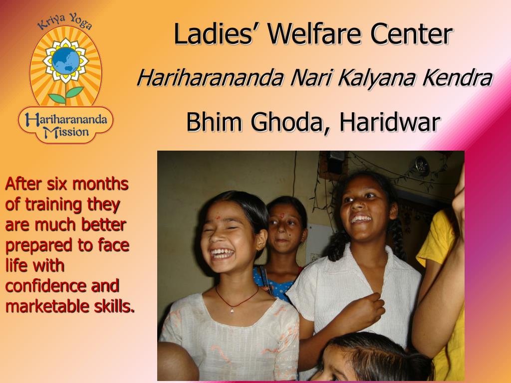 Ladies’ Welfare Center Hariharananda NariKalyana Kendra BhimGhoda, Haridwar After six months of training they are much better prepared to face life with confidence and marketable skills.