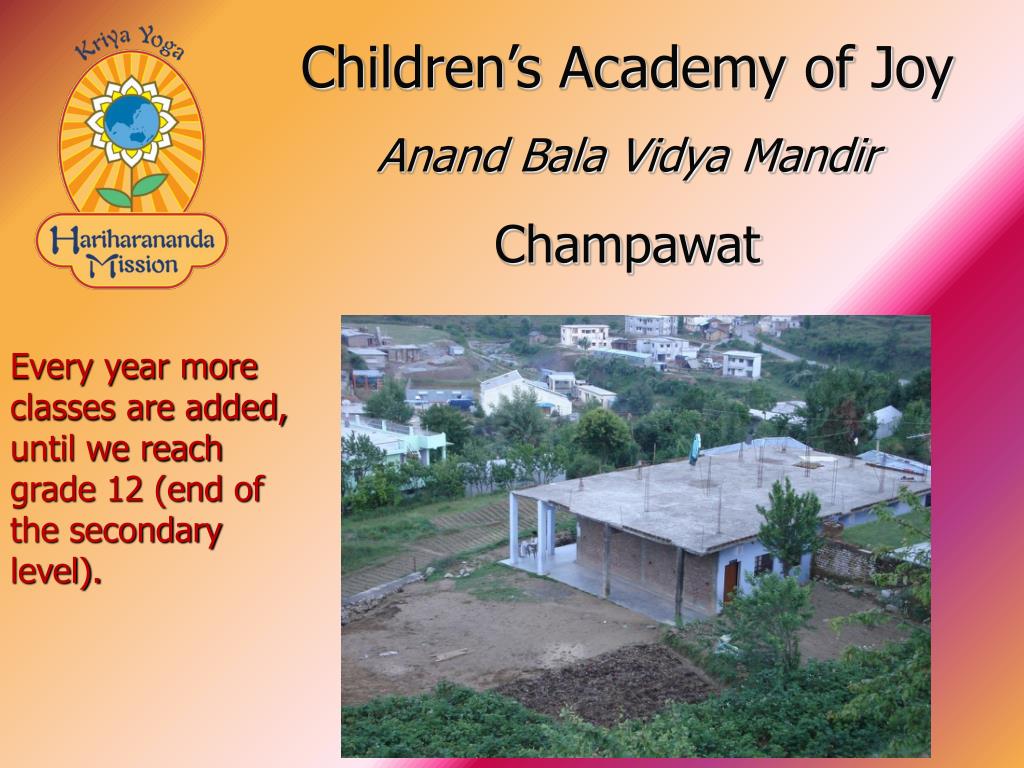 Children’s Academy of Joy Anand Bala Vidya Mandir Champawat Every year more classes are added, until we reach grade 12 (end of the secondary level).