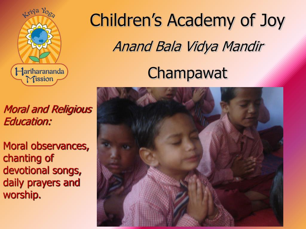 Children’s Academy of Joy Anand Bala Vidya Mandir Champawat Moral and Religious Education: Moral observances, chanting of devotional songs, daily prayers and worship.