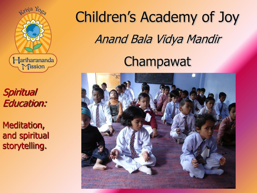 Children’s Academy of Joy Anand Bala Vidya Mandir Champawat Spiritual Education: Meditation, and spiritual storytelling.
