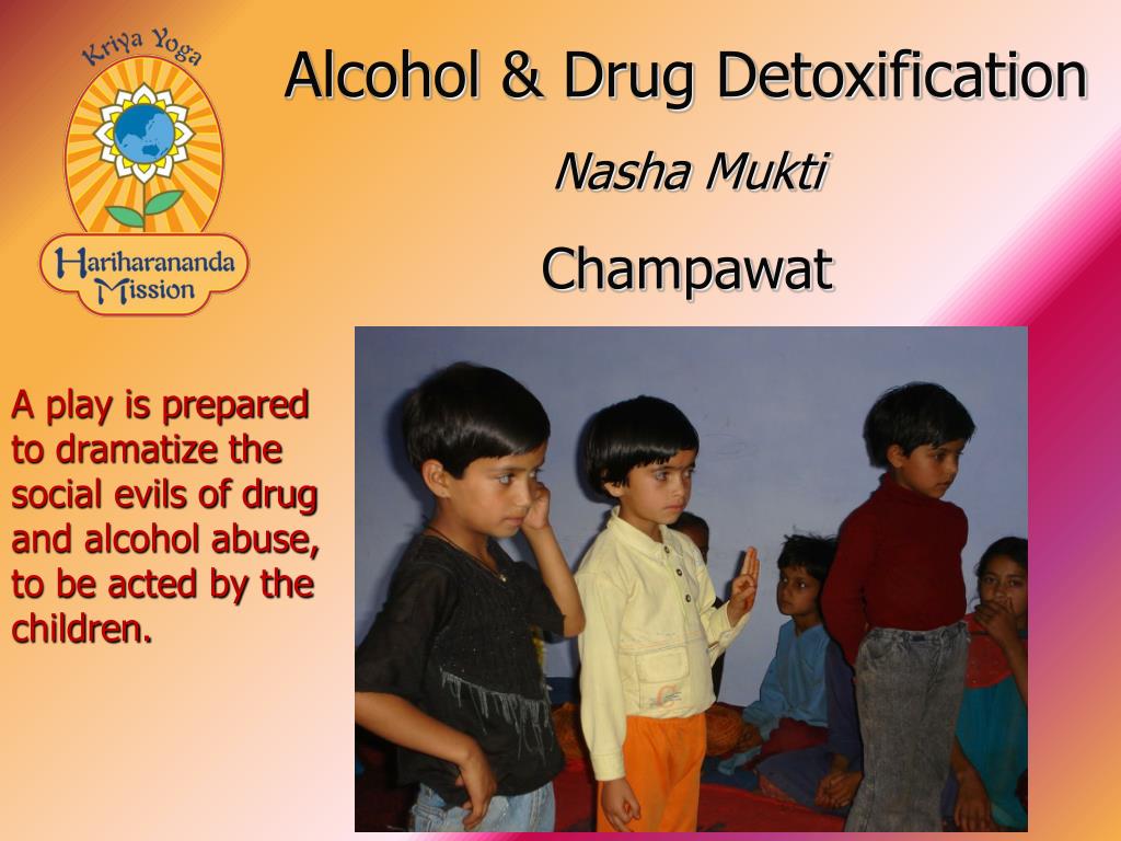 Alcohol & Drug Detoxification Nasha Mukti Champawat A play is prepared to dramatize the social evils of drug and alcohol abuse, to be acted by the children.