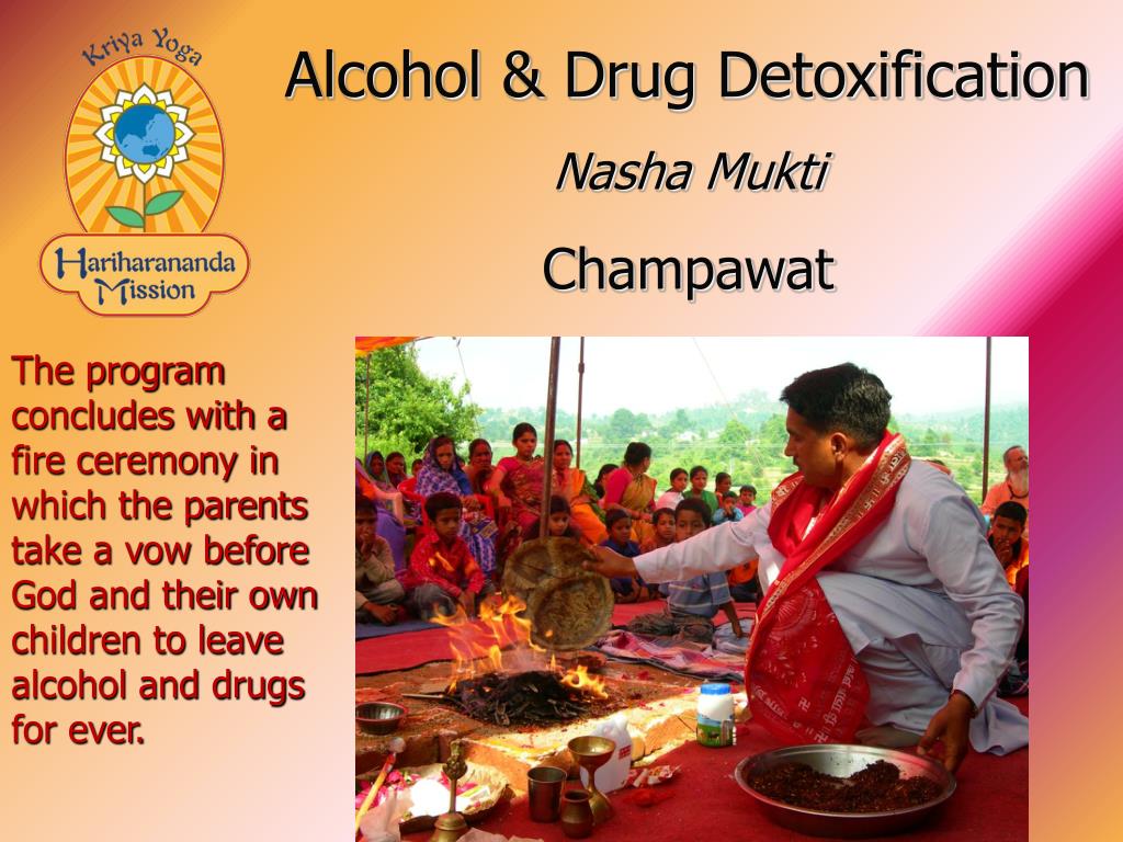 Alcohol & Drug Detoxification Nasha Mukti Champawat The program concludes with a fire ceremony in which the parents take a vow before God and their own children to leave alcohol and drugs for ever.