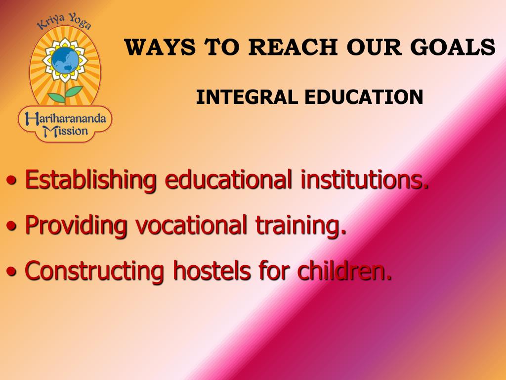 WAYS TO REACH OUR GOALS INTEGRAL EDUCATION • Establishingeducationalinstitutions. • Providingvocational training. • Constructing hostels for children.